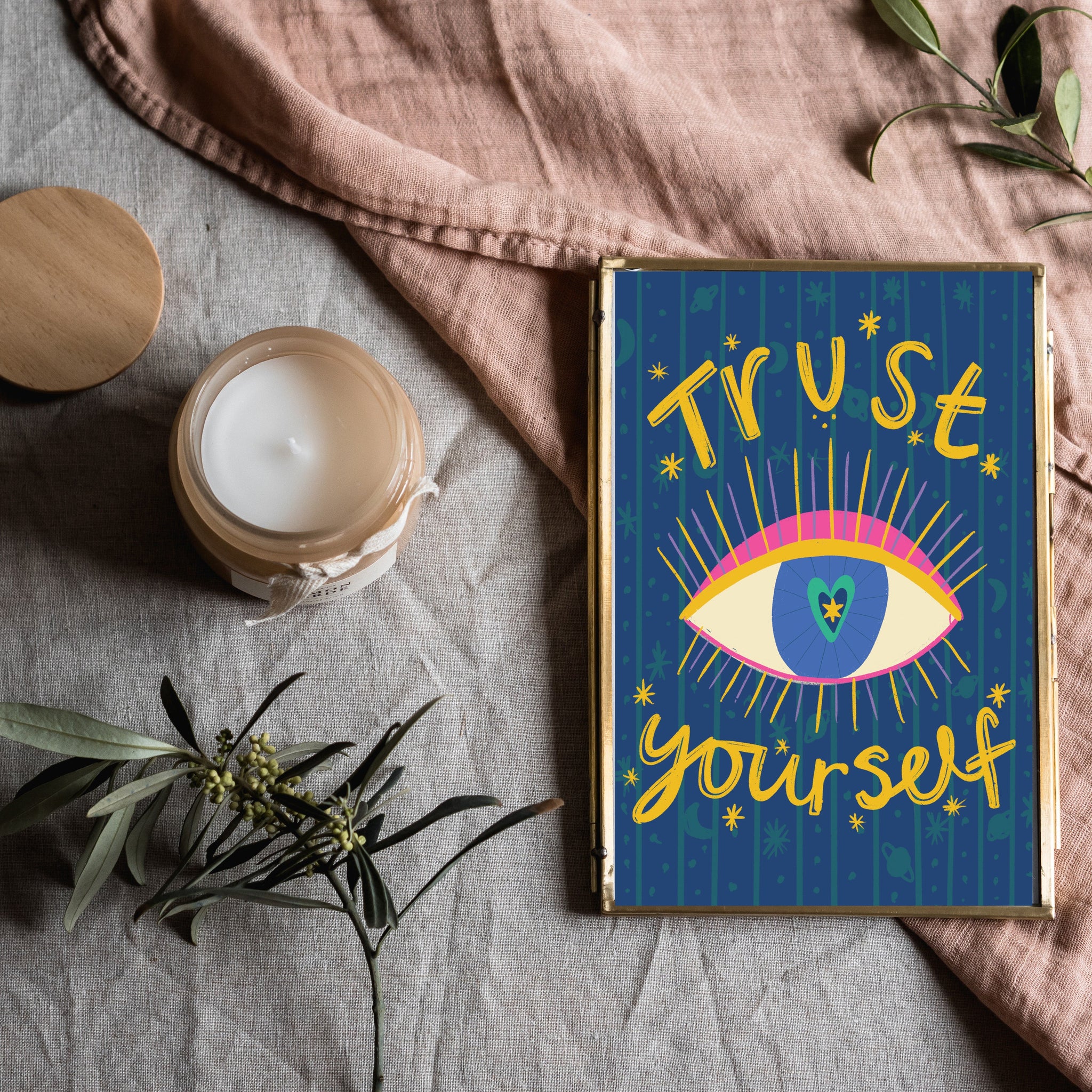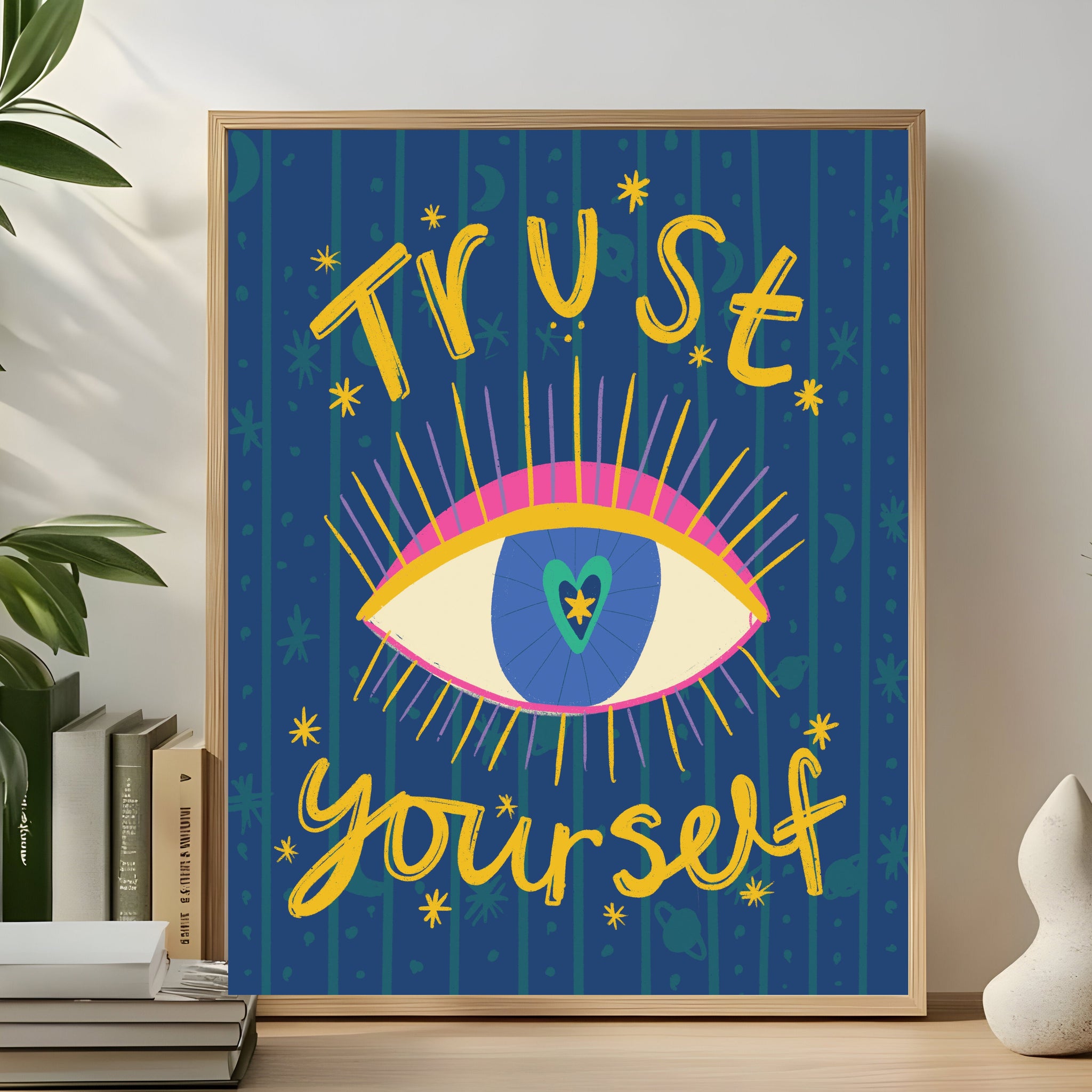 This bold and vibrant “Trust Yourself” affirmation print is designed to empower, uplift, and remind you that your inner wisdom is powerful and worth listening to. Featuring a striking celestial evil eye surrounded by radiant cosmic energy, this artwork symbolises intuition, clarity, and personal strength.